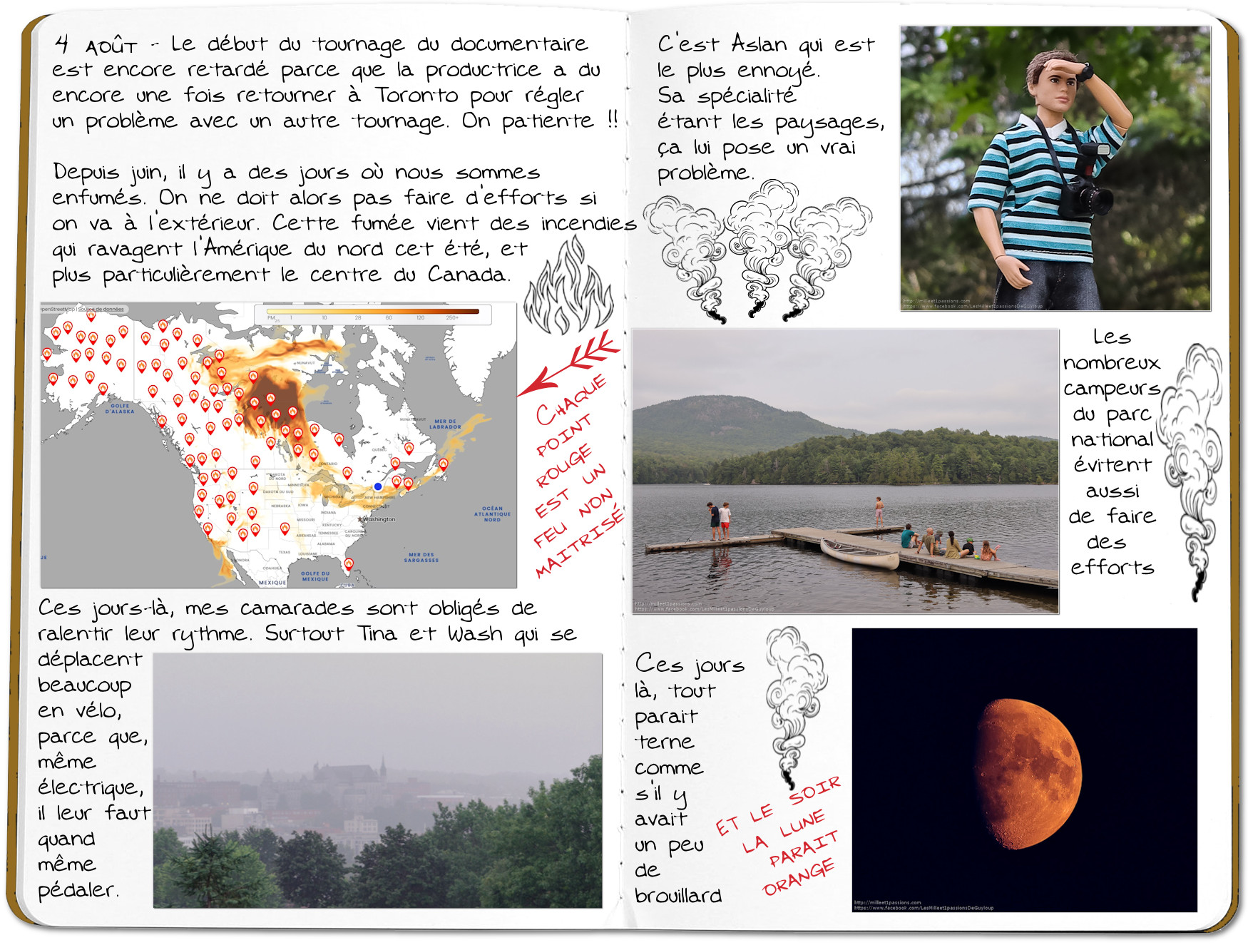 Un peu découragés par le manque de luminosité qui les gêne pour photographier, le soir venu, les baroudeurs se sont assis à la table de pique-nique devant le chalet, et ont observé la lune complètement teintée d'orange à cause des particules de fumée des feux de forêt qui diffusent la lumière bleue et laissent passer les longueurs d'onde plus longues, comme le rouge et l'orange, ce qui donne cette couleur à la lune.